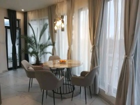 под и стени на замазка, алуминиева дограма, гранитогрес на терасите, стъклени парапети, външни осветителни тела; дворно пространство: озеленено, с ниска ограда между къщите, положени настилки по вътрешния обслужващ път и паркоместата. Срок за Акт 16 - юни 2025год.